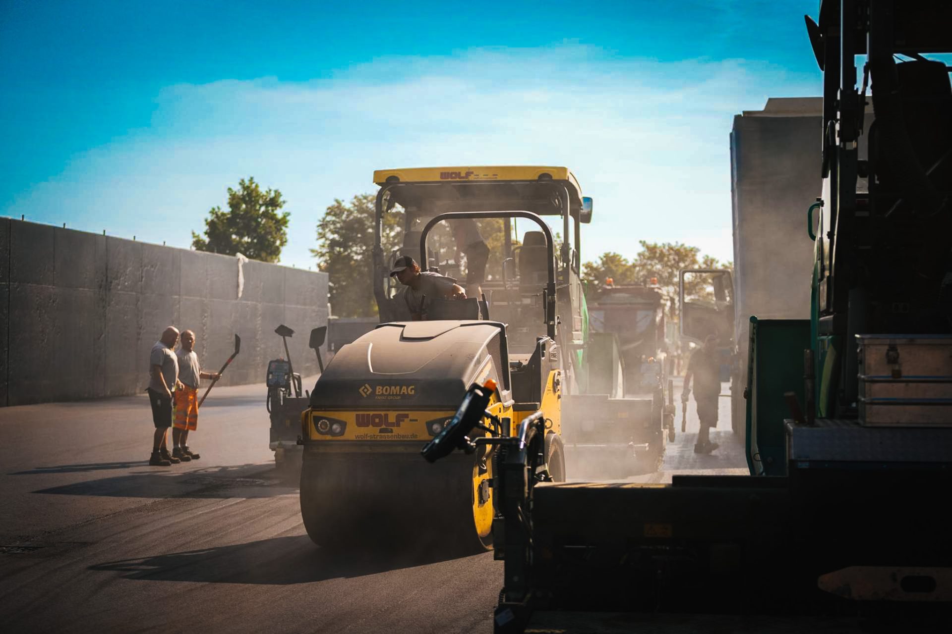 - Einsatz moderner Maschinen (Grader, Walzenzüge, Fertiger) für präzise Erd- und Asphaltarbeiten